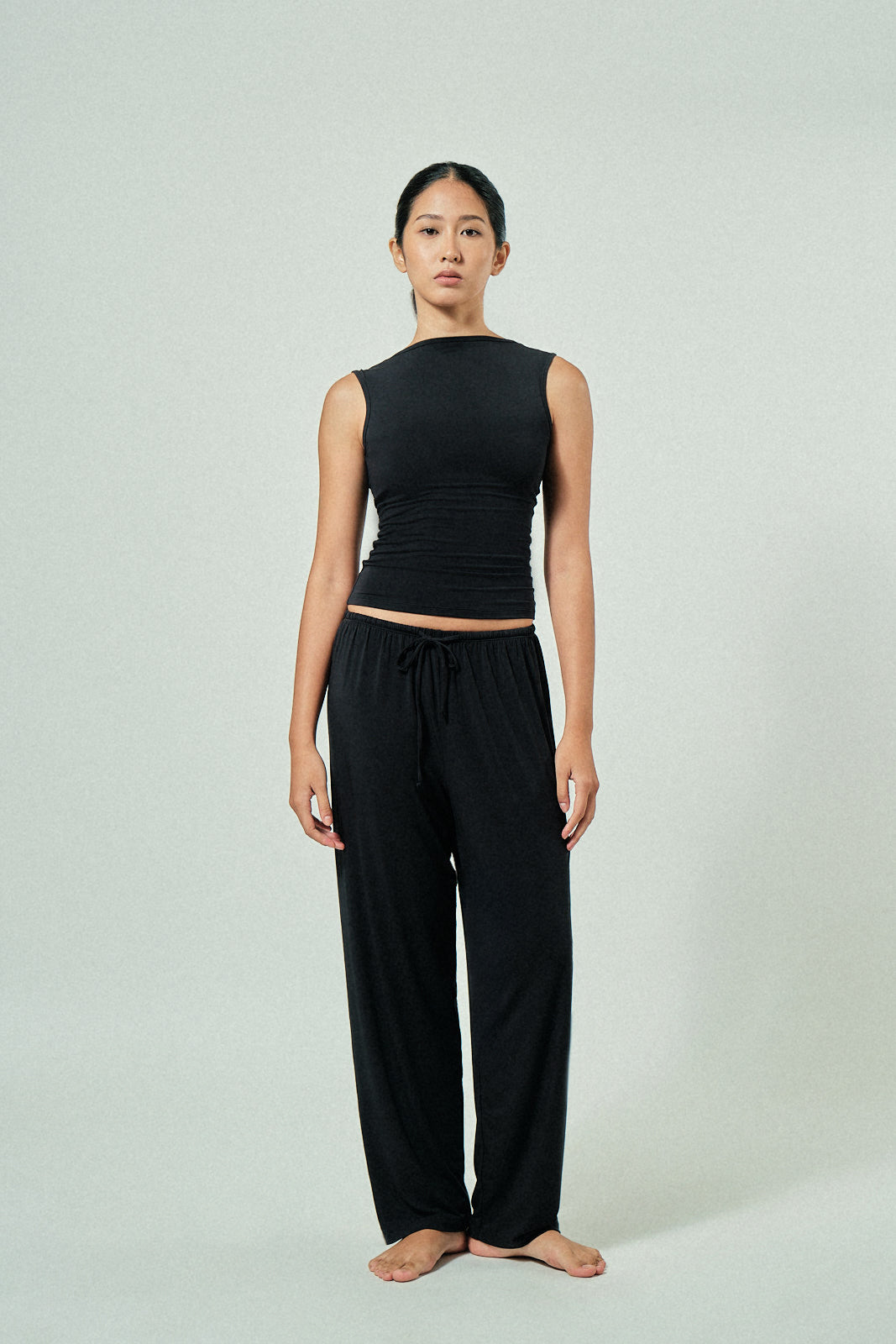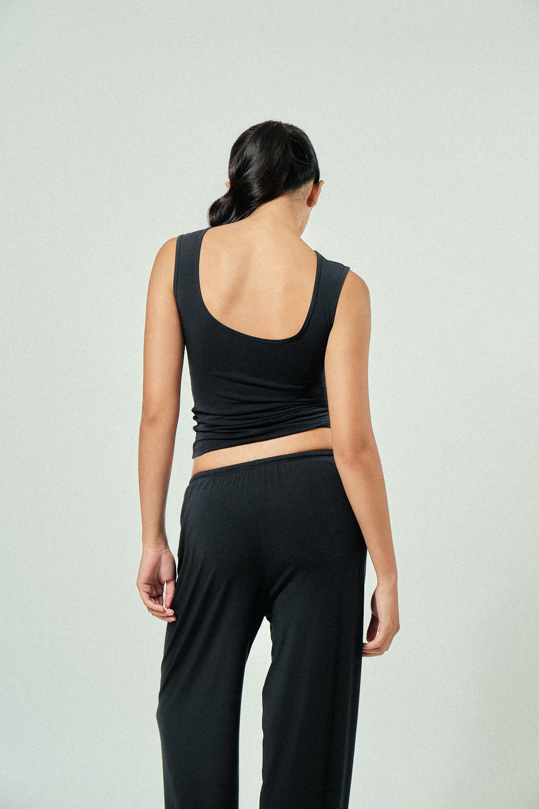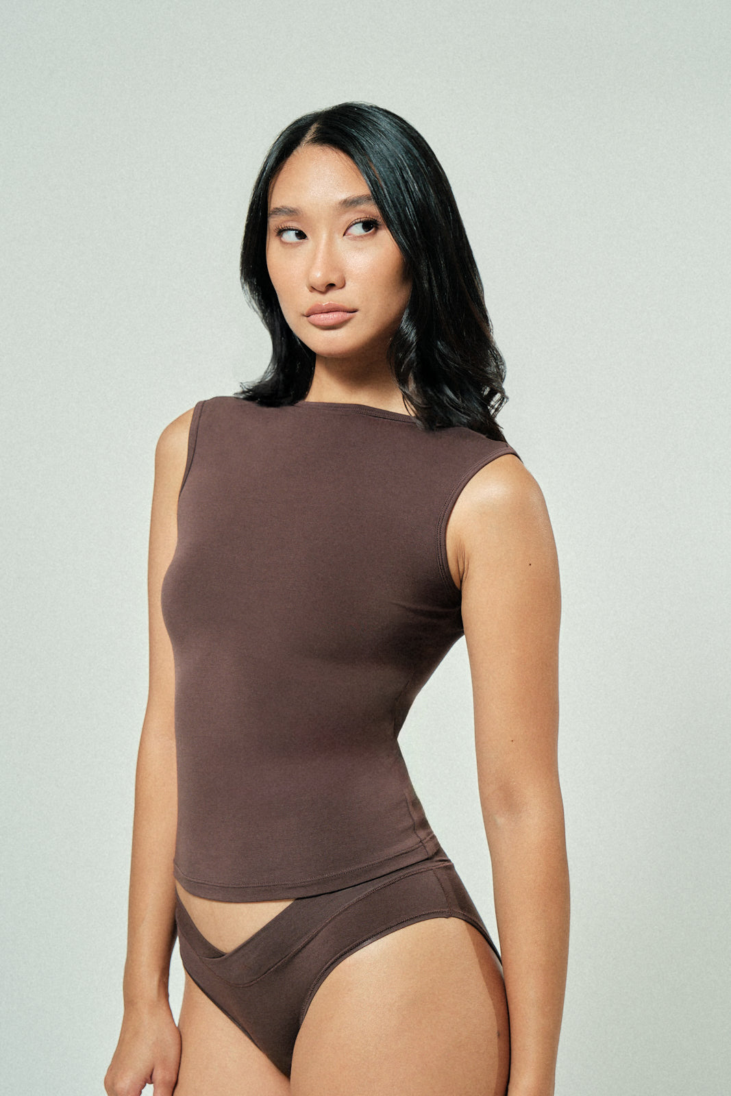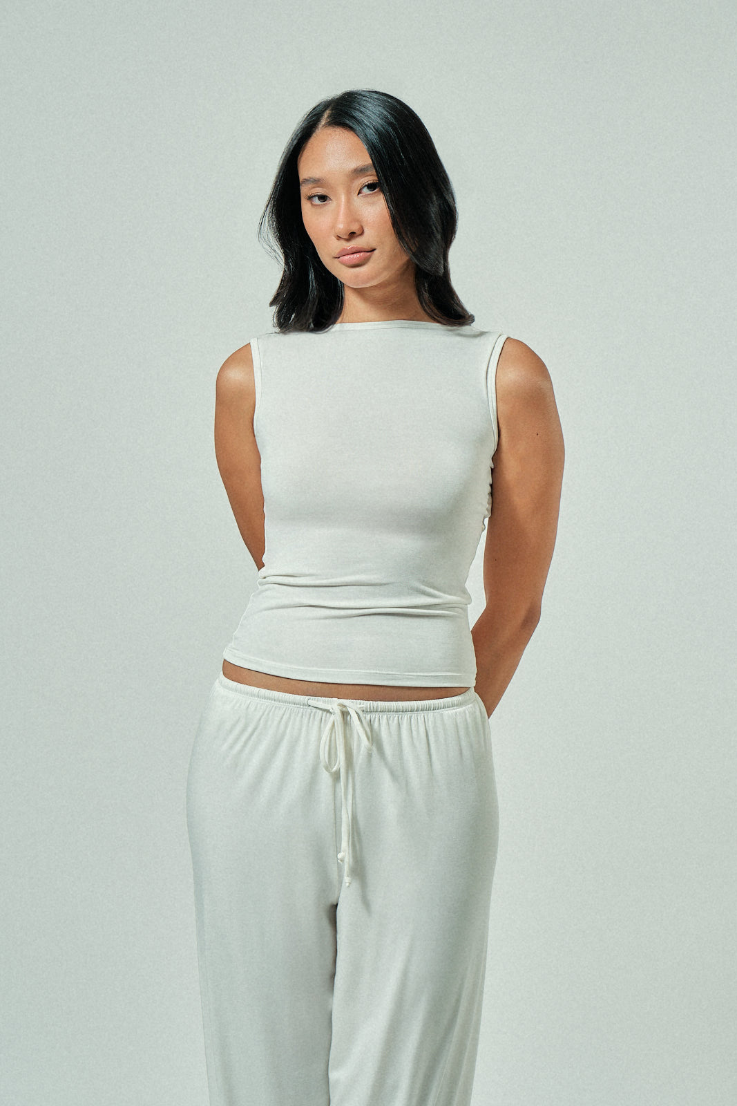 Cool-girl tank with a wide neckline, open back, and clean waist finish. Breathable and flattering in refined modal. Easy to dress up or down.